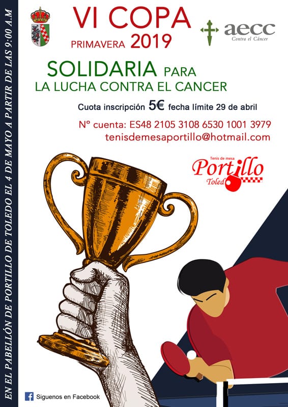 El próximo 4 de mayo de 2019, el club CTM Portillo de Toledo organiza la VI Copa Primavera de Tenis de Mesa en solidaridad para la lucha del Cancer, para más información contactar al e-mail tenisdemesaportillo@hotmail.com