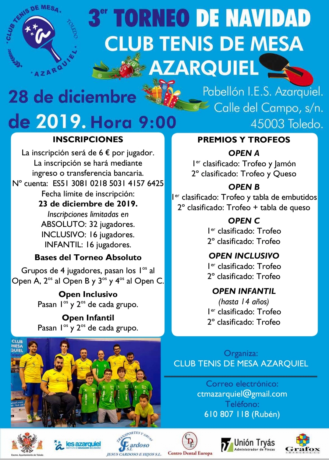 El próximo día 28 de diciembre de 2019 desde las 9:00 horas, el club TM AZARQUIEL, organiza la tercera edición del Torneo de NAvidad de Tenis de Mesa, las inscripciones se pueden formalizar hasta el 23 de diciembre de 2019.