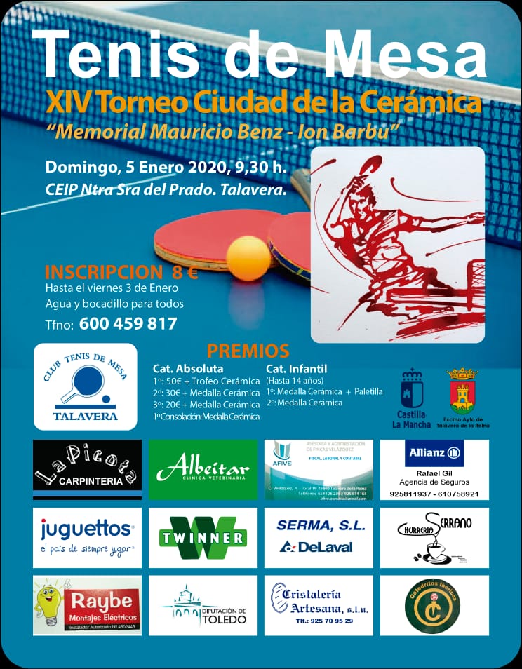 El próximo día 5 de enero de 2020 desde las 9:30 horas, el club CBTM TALAVERA, organiza la décimo cuarta edición del Torneo de Tenis de Mesa CIUDAD DE LA CERÁMICA (Memorial MAuricio Benz-Ion Barbu) , las inscripciones se pueden formalizar hasta el 3 de enero de 2020.