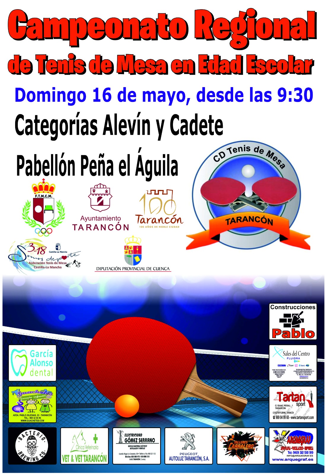 El próximo domingo 16 de mayo, en el Pabellón Peña del Aguila, de la localidad de Tarancón (Cuenca), acoge el Regional Escolar de Tenis de Mesa en las categorías de Alevín y Cadete.